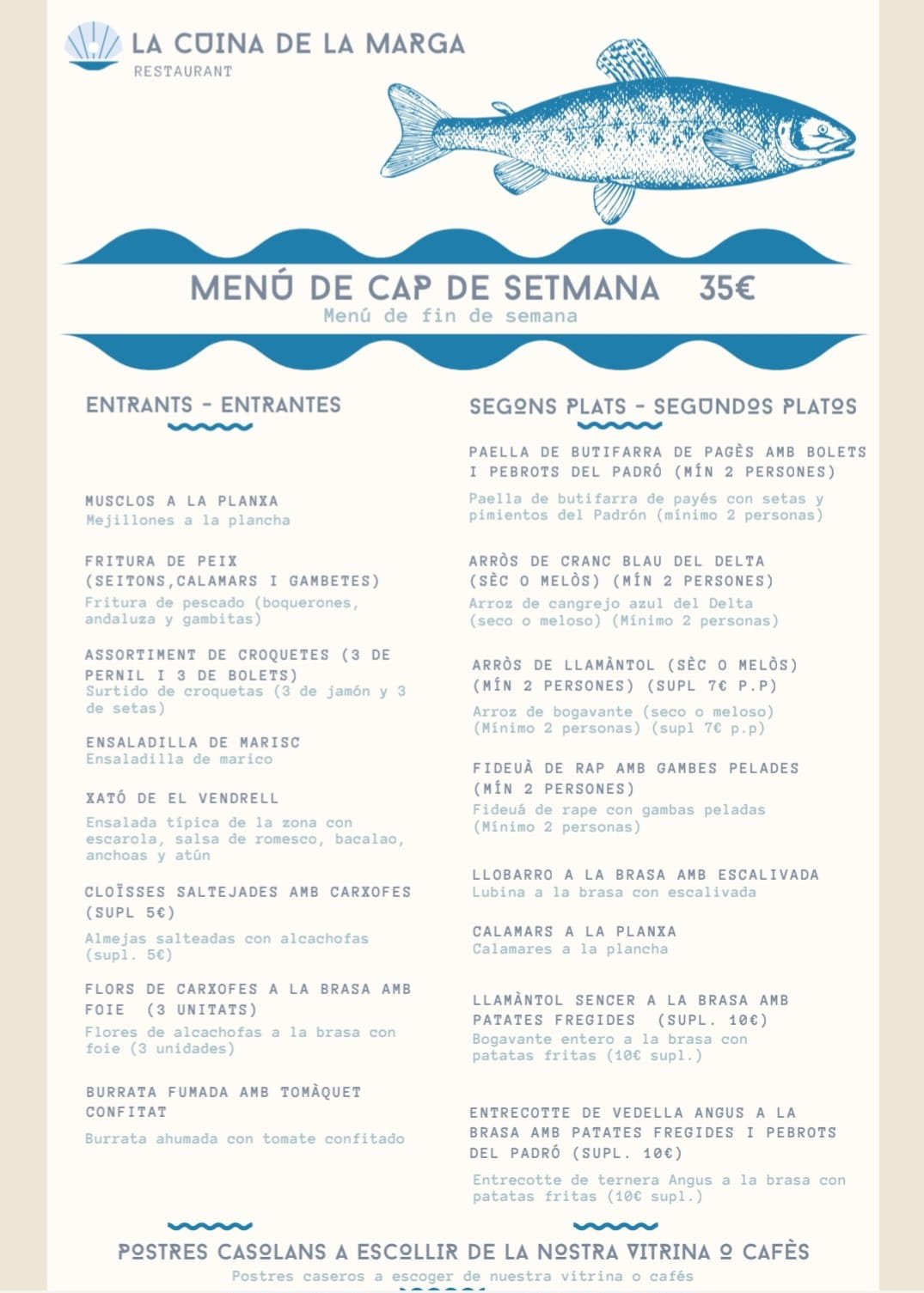 La seva carta obre amb amanides, fresques i generoses, com la de formatge de cabra amb vinagreta de mel i nous, i altres dues propostes que ja ens avancen que aquí qui mana és el peix: la de ventresca de tonyina amb olives de kalamata i la de bacallà fumat. Per compartir, no falten els tradicionals calamars a la romana –frescos del dia-, els calamarsons amb pebrots del Padró, els calamarsets a l'andalusa o les croquetes de peix i marisc. Tot, del mar.