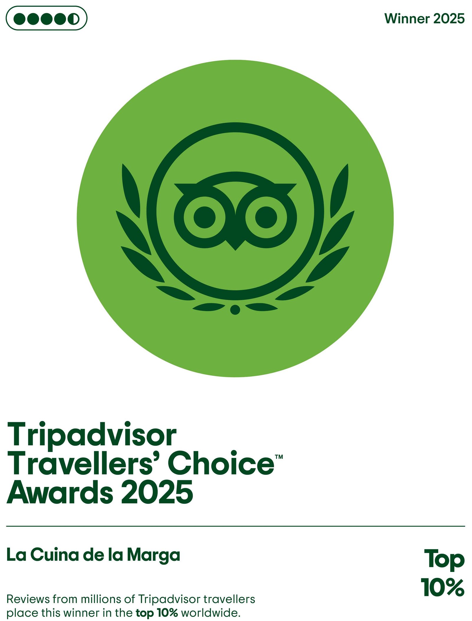 Opinions de milions d'usuaris de Tripadvisor ens coloquen entre els guanyadors dels millors restaurants top 10% del món.